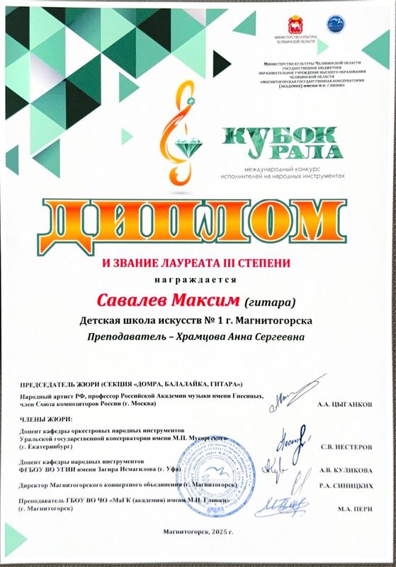 С 1 по 5 ноября в Магнитогорской государственной консерватории прошёл Международный конкурс исполнителей на народных инструментах «Кубок Урала», в котором приняли участие гитаристы Савалев Максим (преп. Храмцова А.С.) и Асабаев Тимур (преп. Губарева В.В.), а также баянист Засухин Кирилл (преп. Багаутдинова Д.Д.). По результатам конкурсного прослушивания Савалев Максим и Асабаев Тимур стали лауреатами III степени, а Засухин Кирилл получил звание дипломанта конкурса.