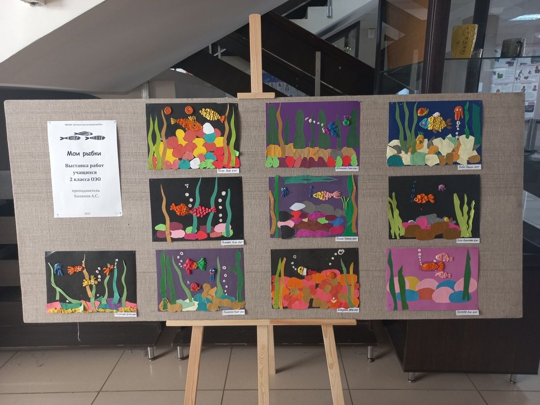 Ученики 2 класса ОЭО выполнили аппликации из бумаги и пластилина «Мои рыбки», преподаватедь Блажнов А.С..