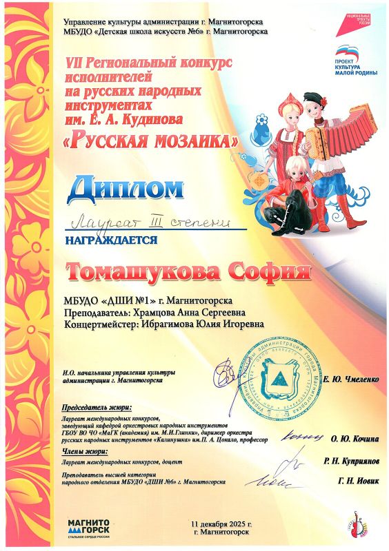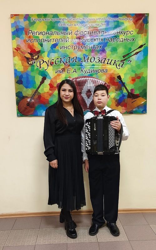 11 декабря в Детской школе искусств №6 прошёл VII региональный конкурс исполнителей на русских народных инструментах «Русская мозаика» им. Е. А. Кудинова, на котором Засухин Кирилл (преп. Багаутдинова Д.Д.) стал лауреатом II степени, а Томашукова София (преп. Храмцова А.С., конц. Ибрагимова Ю.И.) получила звание лауреата III степени.