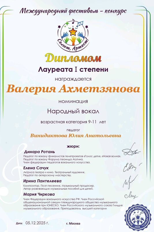5 декабря Ахметзянова Валерия (преп. Винидиктова Ю.А.) стала лауреатом I степени в Международном фестивале-конкурсе«Салют, Артист!» (г. Москва).