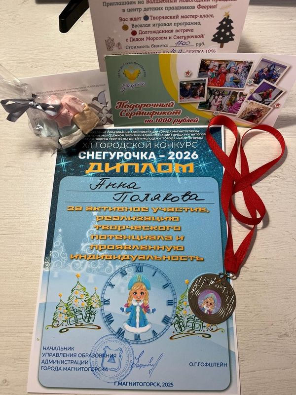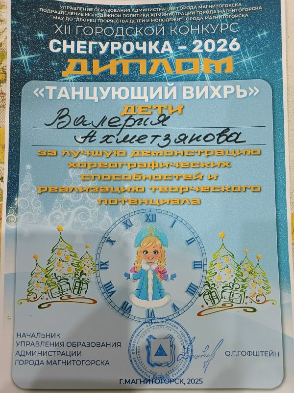 6 декабря во Дворце творчества детей и молодёжи состоялся городской конкурс «Снегурочка — 2026», в котором Снегурочки Ахметзянова Валерия (преп. Винидиктова Ю.А.) и Полякова Анна (преп. Канаева Е.А.) получили дипломы.