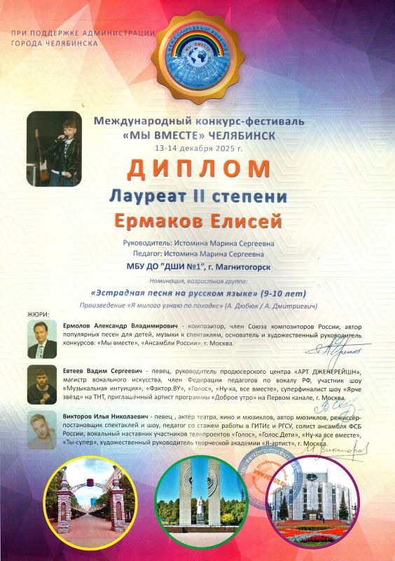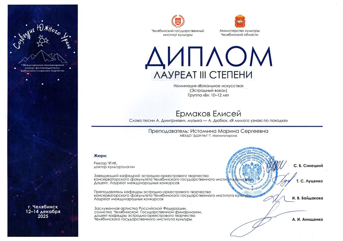 12-14 декабря ученик 4 класса ДШИ №1 Ермаов Елисей стал лауреатом III степени в Международном конкурсе «Созвездие Южного Урала» и лауреатом II степени в Международном конкурсе «Мы вместе» в Челябинске.
