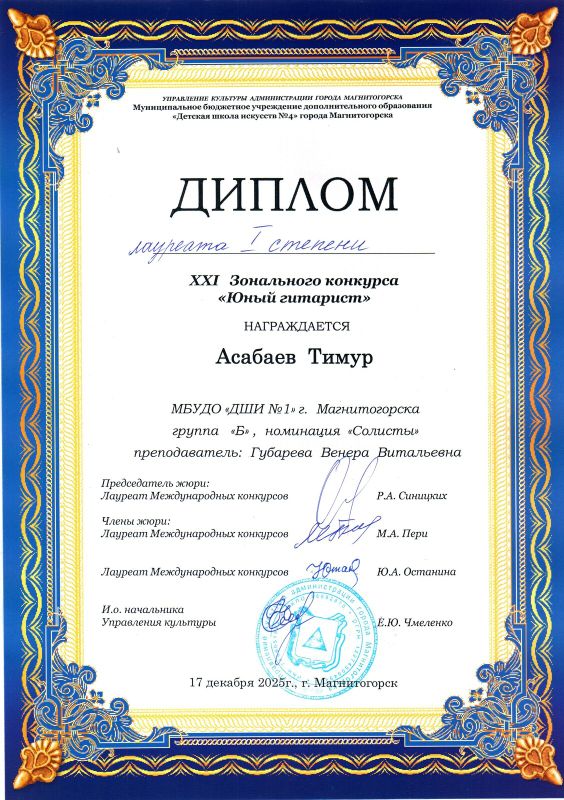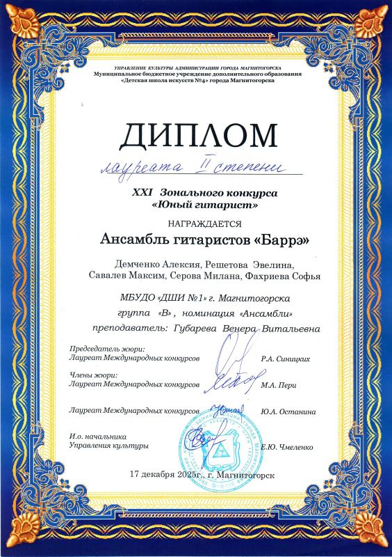 17 декабря в XXI Зональном конкурсе «Юный гитарист» в Детской школе искусств №4 в Магнитогорске ученики преподавателя Губаревой В.В. по классу гитары стали лауреатами: Асабаев Тимур - лауреат I степени, ансамбль гитаристов «Баррэ» - лауреат II степени, Демченко Алексия - лауреат III степени.