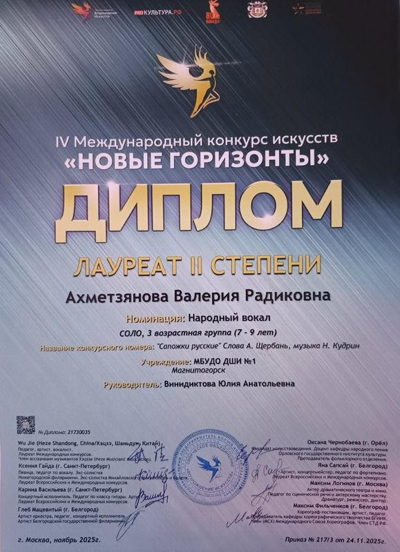 В IV Международном конкурсе искусств «Новые горизонты» (г. Москва) Ахметзянова Лера (преп. Винидиктова Ю.А.) была награждена дипломом лауреата II степени.