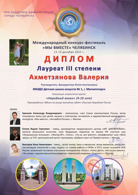 13-14 декабря в Международном конкурсе-фестивале «Мы вместе» (г. Челябинск) Валерия получила диплом лауреата III степени.