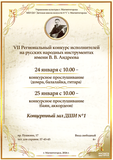 Приглашаем всех желающих посетить VII Региональный конкурс исполнителей на русских народных инструментах им. В.В. Андреева 24 и 25 января в Детской школе искусств №1 по адресу пр. Пушкина, 17 (остановка «Гортеатр»), телефон для справок: 37-43-43.