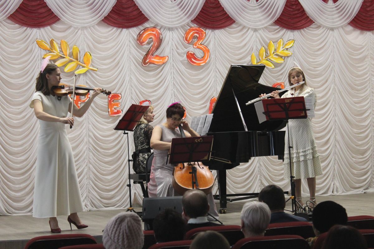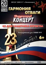20 февраля в Детской школе искусств №1 состоялся городской концерт, посвящённый Дню защитника Отечества «Гармония отваги», организованный совместно с администрацией Орджоникидзевского района, ведущая — Ксения Михайловна Охроменко. На праздничный концерт были приглашены ветераны района и учащиеся СОШ №21 и СОШ №31. С приветственным словом выступили Канаев Константин Сергеевич - заместитель Главы администрации Орджоникидзевского района, Блуметич Юрий Николаевич - председатель Совета ветеранов Орджоникидзевского района. На концерте сыграли и спели инструментальный ансамбль преподавателей в составе Морозова Е.В., Канаева Е.А., Гришина О.Г., Королева К.Ю., ансамбль скрипачей «Элегия», (конц. Копылова Т.В., рук. Морозова Е.В.), фортепианный ансамбль Кумусбаевой Юлии и Рожновой Екатерины (преп. Ибрагимова Ю.И.) Сибагатуллина Кристина (преп. Капустина Н.И.), Чепелевич Кирилл (преп. Копылова Т.В.), Рожнова Екатерина (преп. Ибрагимова Ю.И.), Мокичева Алиса (преп. Костеркина Н.Н.), Засухин Кирилл (преп. Багаутдинова Д.Д.), Савалев Максим (преп. Храмцова А.С.), Базарова Юлия (преп. Костеркина Н.Н.), Зинина Виктория (преп. Винидиктова Ю.А.).