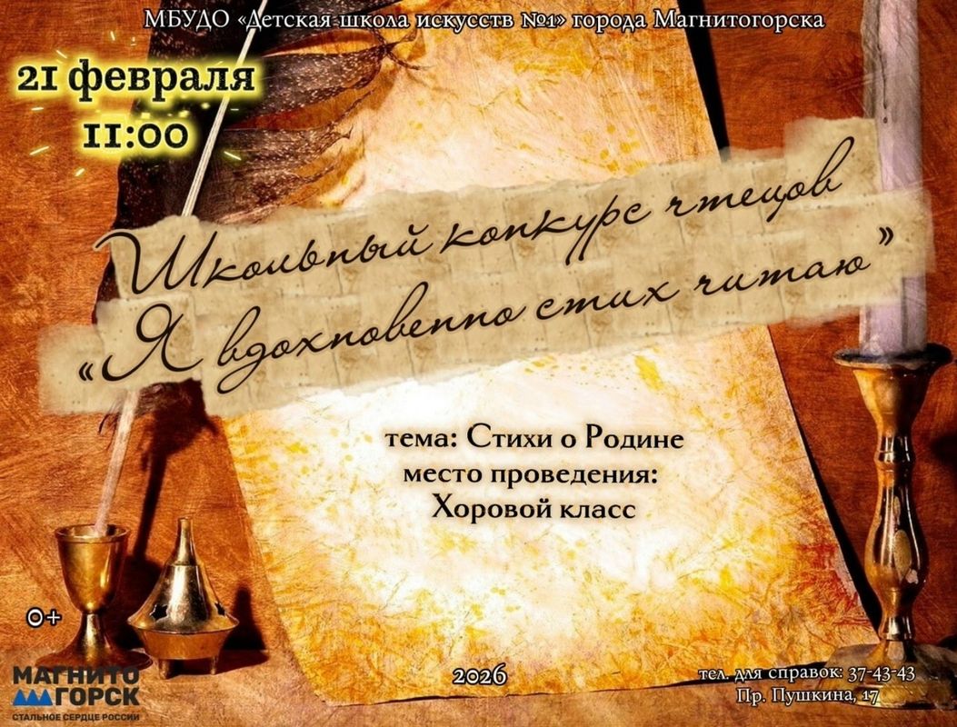 21 февраля в Детской школе искусств №1 прошёл конкурс чтецов «Я вдохновенно стих читаю», в котором приняли участие учащиеся вокального отделения и отделения хорового пения. Темой конкурса стали стихи о Родине.
