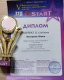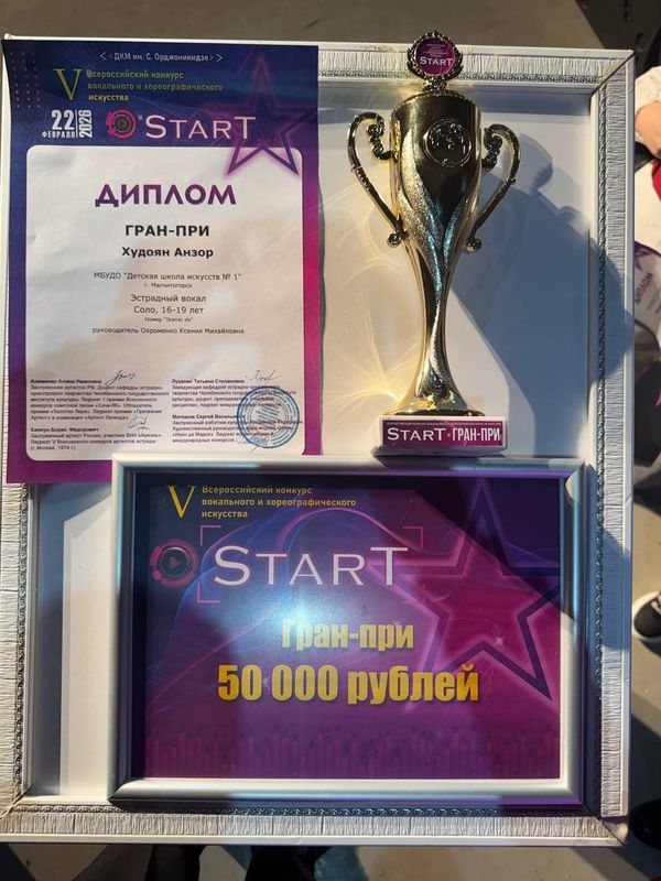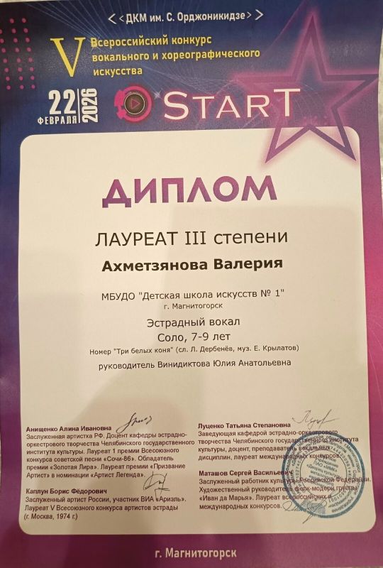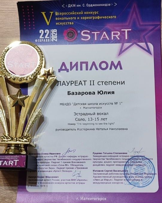 22 февраля в ДК металлургов им. С. Орджоникидзе прошёл V Всероссийского конкурса вокального и хореографического искусства «StarT», в котором Худоян Анзор (преп. Охроменко К.М.) получил Гран-при, Худоян Милена (преп. Охроменко К.М.) стала лауреатом I степени, Базарова Юлия (преп. Костеркина Н.Н.) и Киселёв Денис (преп. Костеркина Н.Н.) получили диплом лауреатов II степени, Ахметзянова Валерия (преп. Винидиктова Ю.А.) - лауреат III степени.