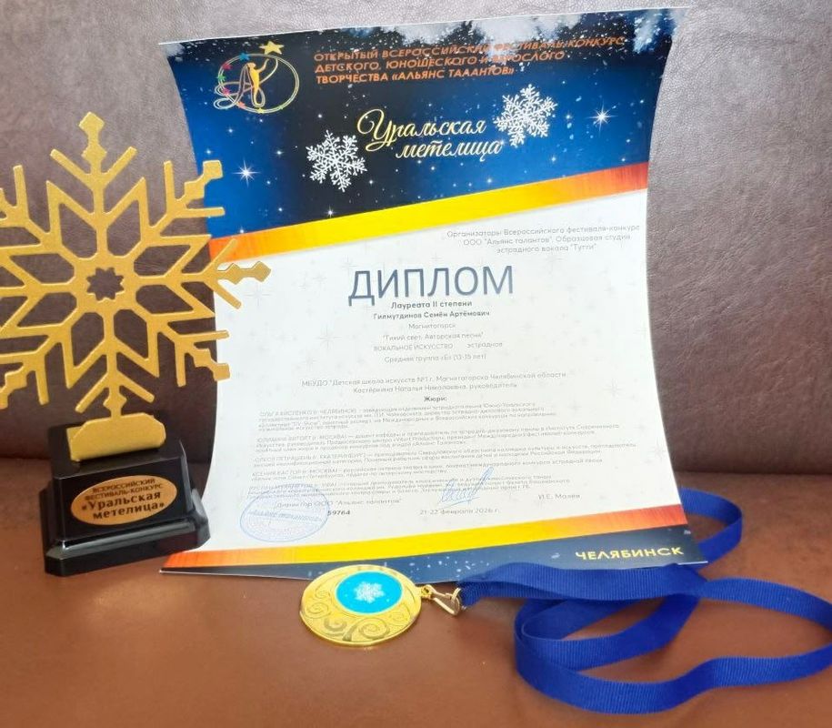 21 февраля Гилмутдинов Семён (преп. Костеркина Н.Н.) стал лауреатом II степени Всероссийского фестиваля-конкурса детского, юношеского и взрослого творчества «Уральская метелица» в Челябинске.