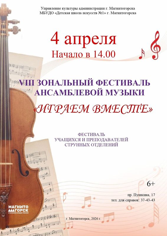 В Детской школе искусств №1 состоялся VIII Зональный фестиваль ансамблевой музыки «Играем вместе». В фестивале приняли участие учащиеся и преподаватели струнных отделений городских детских школ искусств №1, №6, №7, «Камертон», «Дом музыки» и Детской школы искусств Агаповки.