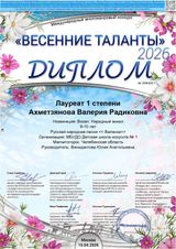 15 апреля Ахметзянова Валерия (преп. Винидиктова Ю.А.) стала обладателем звания лауреата I степени Международного многожанрового конкурса «Весенние таланты» в Москве.