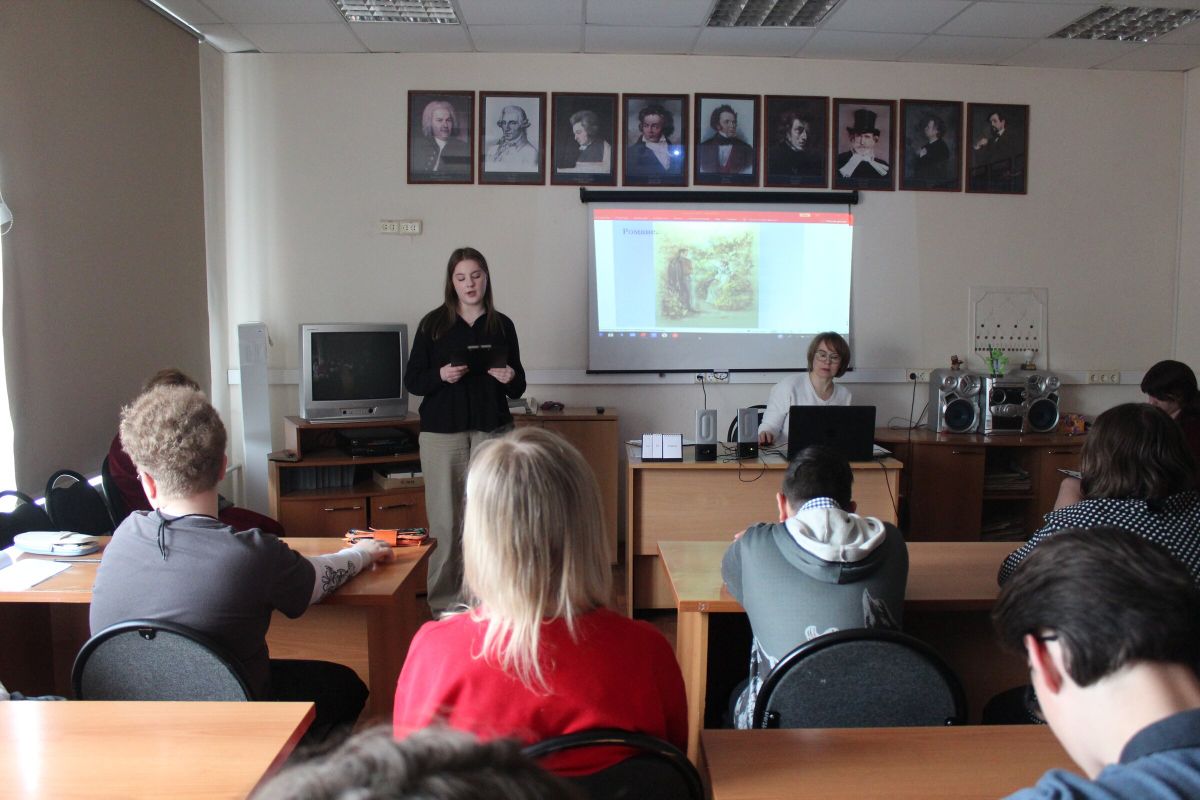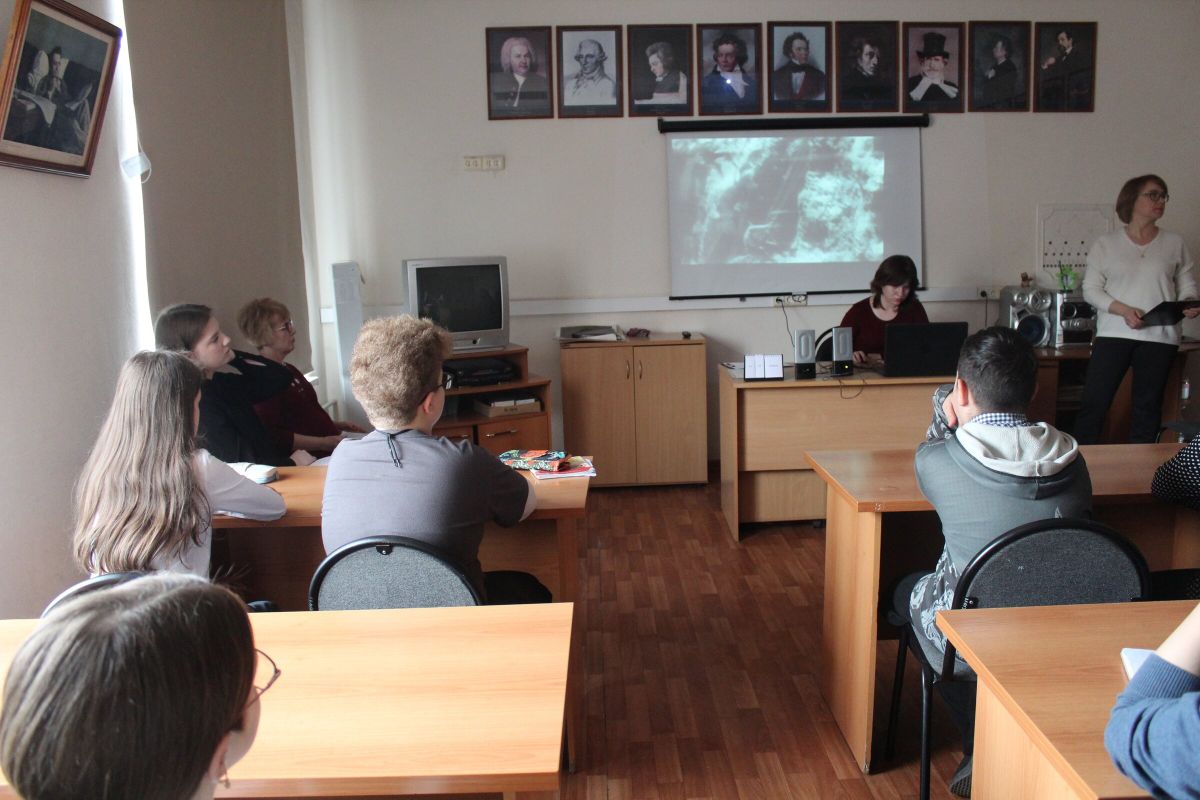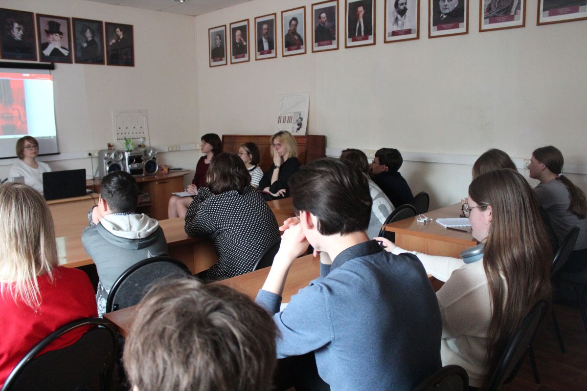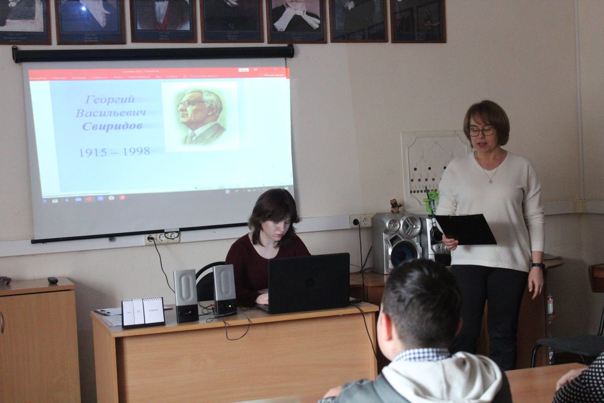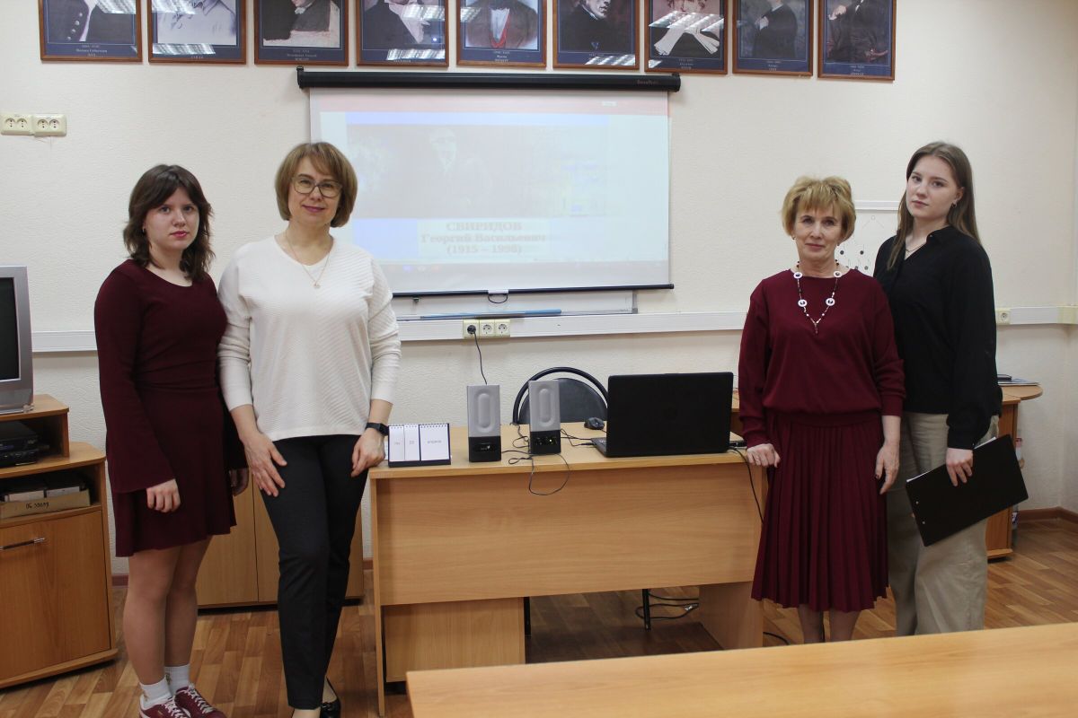 10 апреля, в рамках проекта «Музыкальная литература современности», студенты и преподаватели отделения теории музыки Колледжа искусства и культуры Ю.В. Кузьмина, Е.Ю. Сычева, Арина Балдицина и Виктория Хахалина провели для учащихся 4 и 6 классов ДШИ №1 лекцию ««Композитор души русской»: к 110-летию Георгия Свиридова» о жизни и творчестве великого русского композитора Георгия Свиридова.
